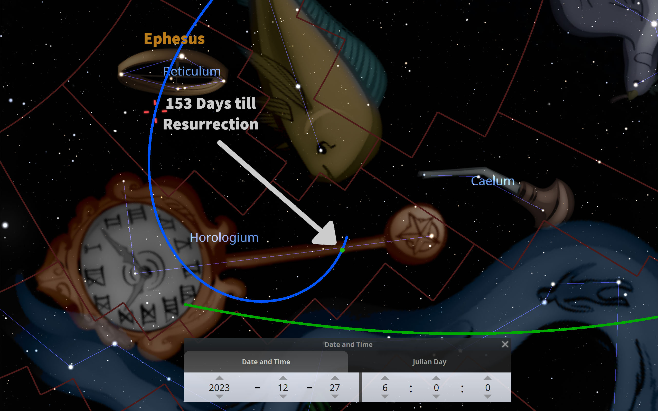 This calls to mind the story of the disciples fishing at the lake after Jesus’ resurrection when He told them to cast their net on the other side, and they caught 153 trophy fish. In the article It is the Lord, we explain how these 153 fish point to a final stretch of days until meeting Jesus in the air, just as the disciples met Him on the shore. If we apply this principle to the sign of the Son of man, we discover something marvelous. The last 153 days until the end of the sign are from December 27, 2023, to May 27, 2024. In heaven, comet E3 is in perfect position on December 27, 2023, squarely in the Reticulum constellation, ready to gather the full count of the catch to the Lord.