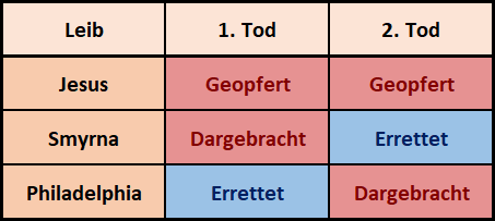 Philadelphia erhielt bereits die Krone des Lebens,[13] und Jesus warnt, sie sich von niemandem nehmen zu lassen, weshalb die Gläubigen dieser Gemeinde vom ersten Tod verschont werden, da Jesus verspricht, sie vor der Stunde der Versuchung zu bewahren.[14] Smyrna hingegen empfängt die Krone des Lebens nach dem Tod und die Verheißung, vom zweiten Tode bewahrt zu werden:
