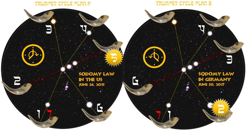 Two fishes were hurt in the heavenly sign. They are mirror images of each other. Remember what happened in the fifth trumpet of the first trumpet cycle! On June 26, 2015, the United States introduced same-sex marriage. If trumpet cycles A and B are placed side by side, an astonishing fact comes to light: same-sex marriage was introduced in the USA and Germany in the same pie slice of the Orion clock! When the New World finally rejected the God of creation in the Bible in the LGBT Pride Month of June, 2015, we were in the fifth trumpet of the trumpet cycle of Plan A, while the Old World with Germany at the head also decided to expel the God of the country in the month of the unclean-bird movement in 2017. June 30, 2017 fell into the second trumpet in the backwards-running trumpet cycle, but it is the same segment of the Orion clock. The “image of the beast” had thus formed a mirror image—i.e. completely.
